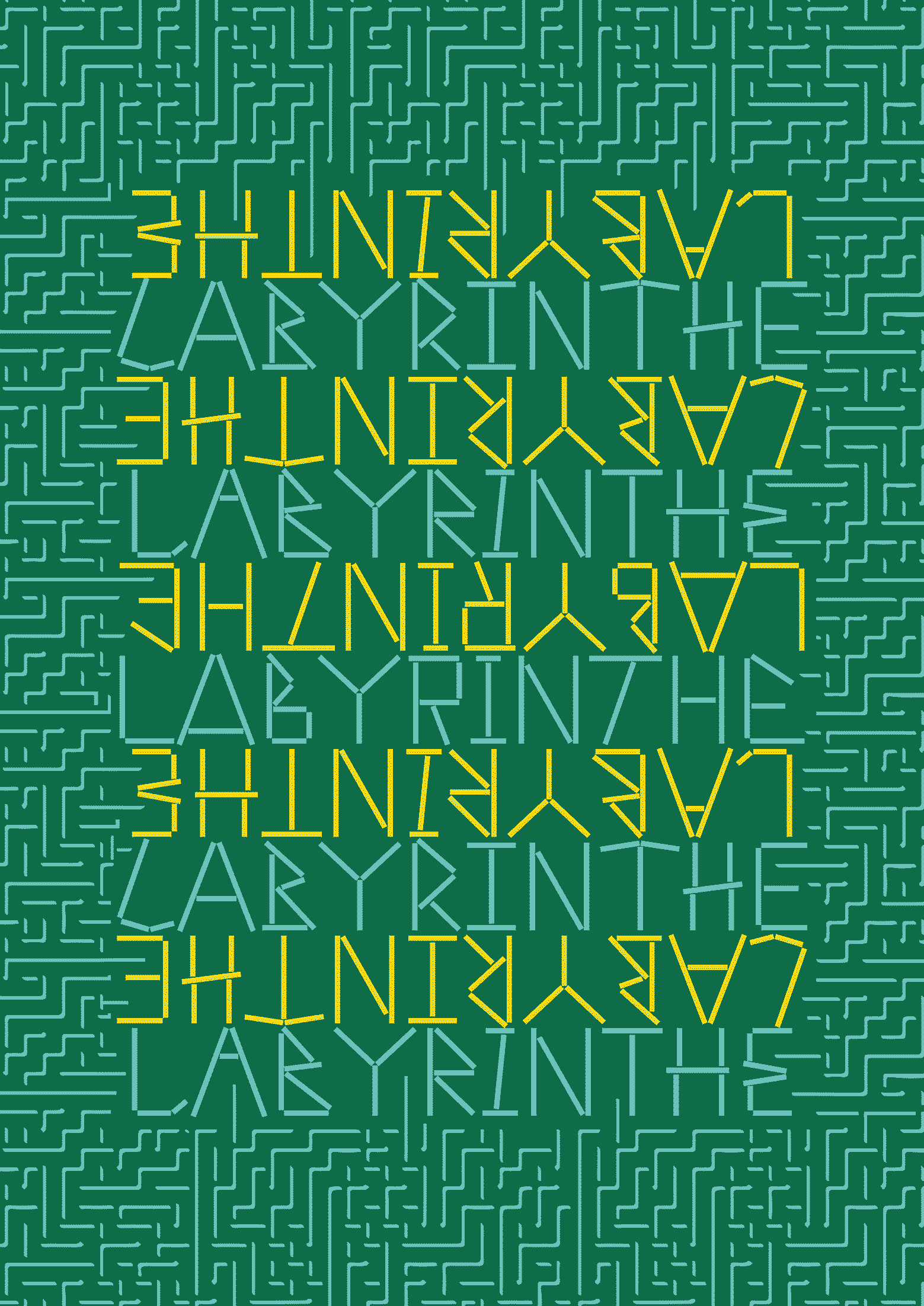 Une affiche où je mélange les lettres et le fond qui sont de la même graisse. L'idée du labyrinthe me semble entrer totalement dans le thème du déconstructivisme, on se base sur du géométrique et on se perd visuellement.