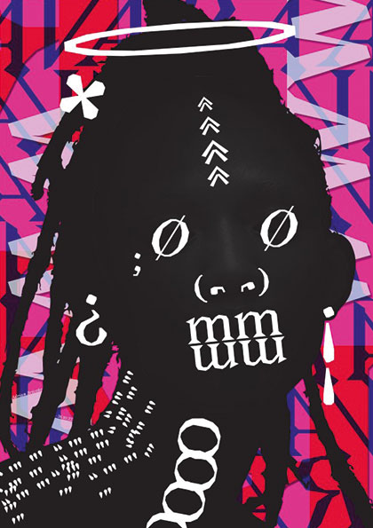 Puis dans la forme que ces deux R en miroir faisait j’ai vu un bec et des yeux. Je me suis donc décidé à “dessiner” grâce aux formes des lettres et des glyphes.