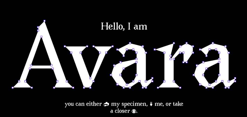 Avara est une famille de caractères sans courbe avec empattement transitionnel libre. Le placement de ses nœuds est exclusivement basé sur une grille carrée grossière. La raison originale de ce choix de conception était de faciliter la collaboration sur la police, et il en résulte maintenant les formes radicales et très contraintes de cette famille de caractères. Il a été lancé et publié pour la première fois en novembre 2011 par Raphaël Bastide ; il a été mis à jour depuis et enfin publié ici. Il pourrait être mis à jour à nouveau à l'avenir, cependant. Peut-être par vous.
