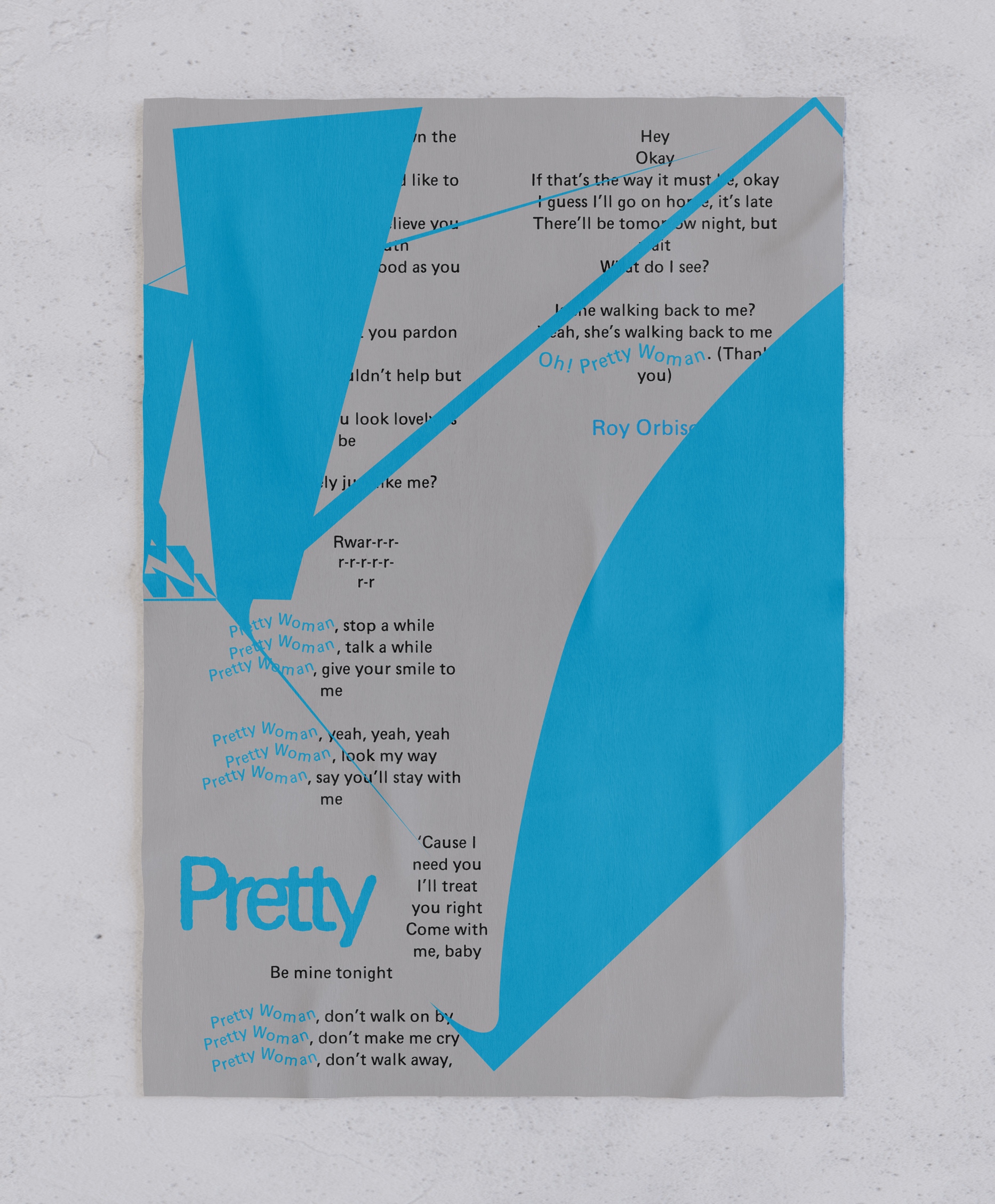 Affiche composée avec la typographie "Fluxisch". J'ai pris les paroles de la musique "Oh, Pretty Woman" de Roy Orbison. L'aplat bleu est une erreur d'affichage d'Indesign que j'ai décidé de reproduire car elle ajouait du contraste. J'ai également joué sur l'interlettrage en rapprochant les lettres du mot "Pretty".