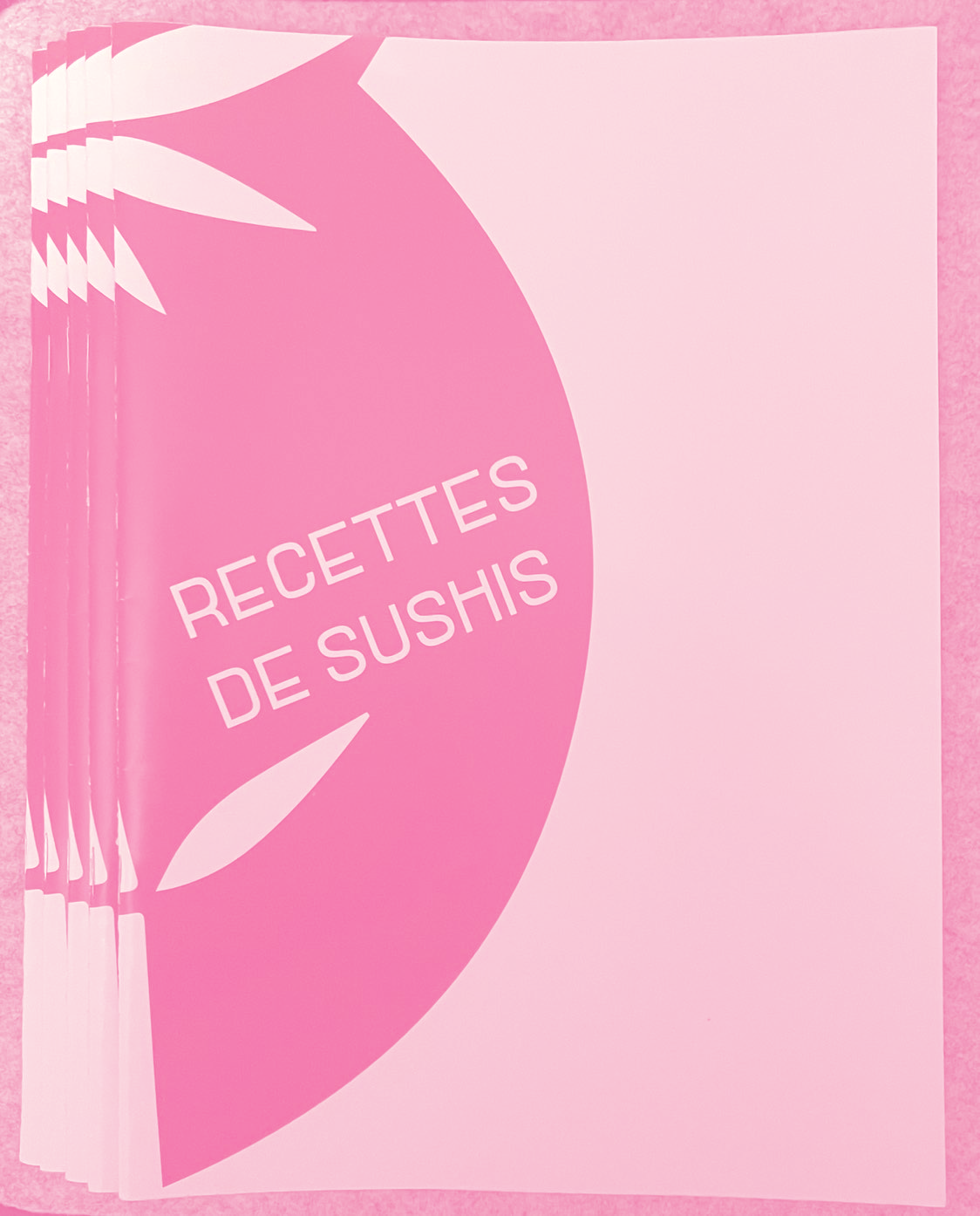 Comme pour le sticker, il a fallu réflechir à une manière de hiérarchiser les informations. J'ai donc utilisé la millimetre également en plusieurs graisses. J'ai joué sur les couleurs noir, rouge, blanc pour amené un côté japonisan au livre comme les sushis sont japonais.