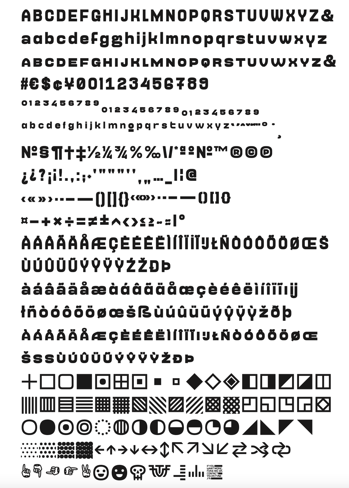 Enfin, cette famille de caractères s'accompagne d'une large gamme d'ornements techniques et géométriques permettant de créer des motifs dialoguant avec le texte. Ces ornements s'inspirent du début de l'ère informatique et des graphiques techniques utilisés dans l'imprimerie. Par conséquent, ils peuvent être très utiles pour mettre en page des documents techniques, des cartes, ou pour accompagner et mettre l'accent sur l'aspect technologique de la police sur des documents graphiques.