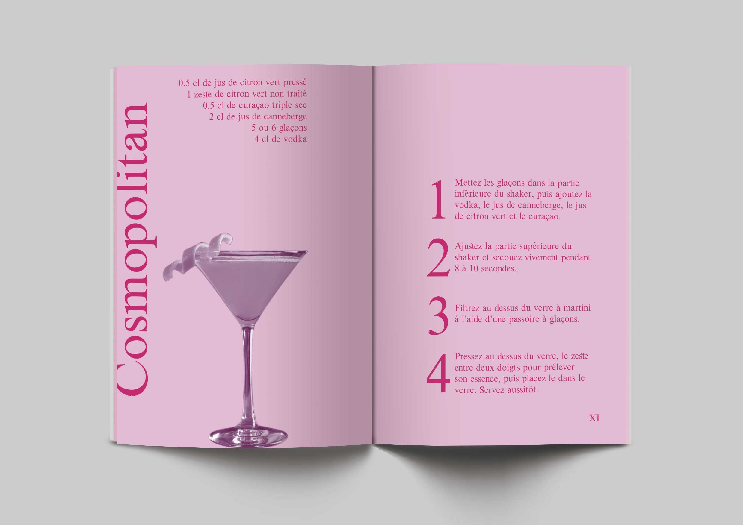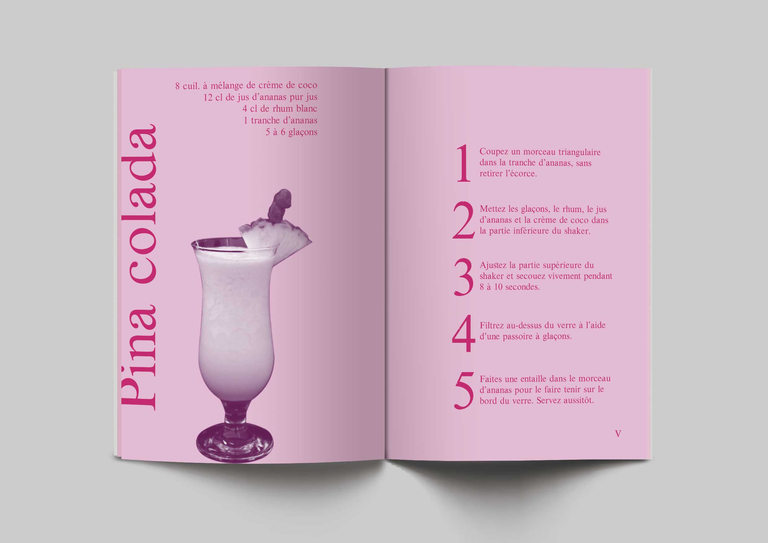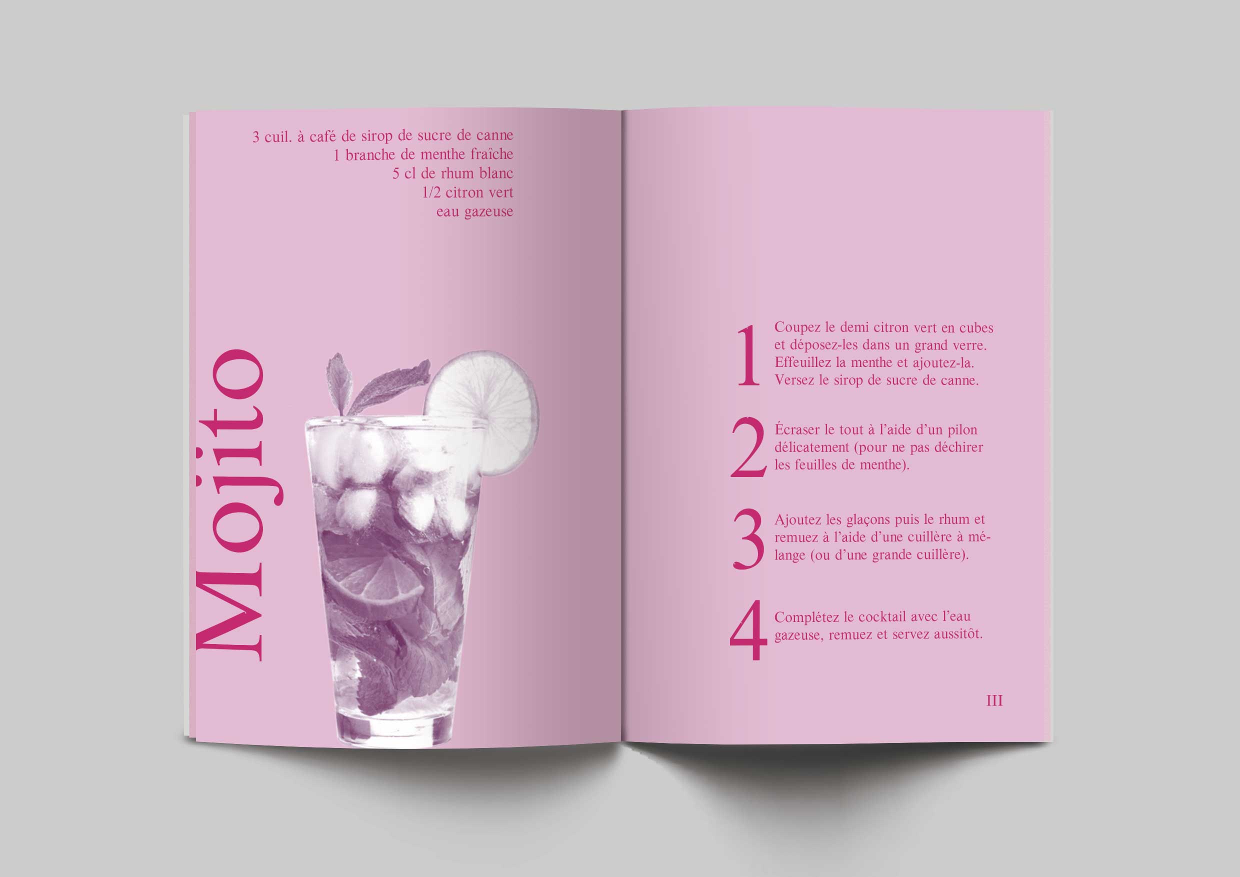 Pour mon livre de recette, j'ai choisi 10 recettes de cocktails assez connus. J'ai imprimé celui-ci en format de 7x12cm, un petit format de poche afin qu'on puisse l'avoir partout avec nous. Pour ma mise en page, j'ai choisi de faire du ton sur ton. J'ai fait une monochromie en rose que j'ai imprimé sur du papier rose. Pour ma mise en page, j'ai chaque fois mis sur la page de gauche le nom du cocktail, ses ingrédients et une image de ce cocktail et sur la page de droite les étapes à suivre pour le réaliser.