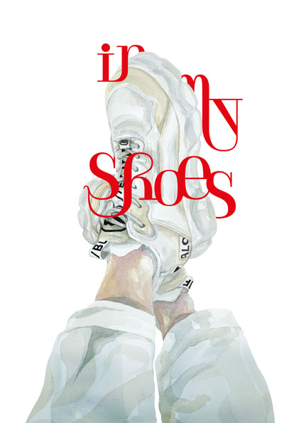J'ai d'abord représenté mes baskets, que je porte tous les jours, à l'aide d'aquarelles. Ensuite, j'ai intégré la phrase « In My Shoes » dans mon affiche, de sorte que les chaussures et l'écriture forment une unité. J'ai déformé et allongé les boucles de chaque lettre, comme ça les mots serpentent devant et derrière les chaussures. De plus, les boucles de la typographie rappellent les lanières de mes baskets.