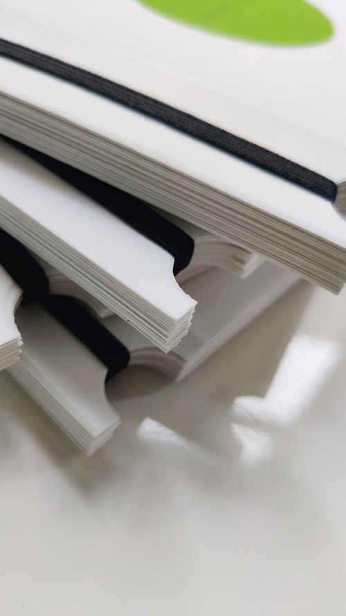 La reliure se présente sous la forme d'un élastique maintenu par des demi-cercles sur le côté droit. Pour donner de la légèreté aux cahiers, j'ai inséré des feuilles de calque entre chaque recette, qui reprennent les cercles de la découpe en vert. En plus j'ai fait des illustrations adapté aux recettes