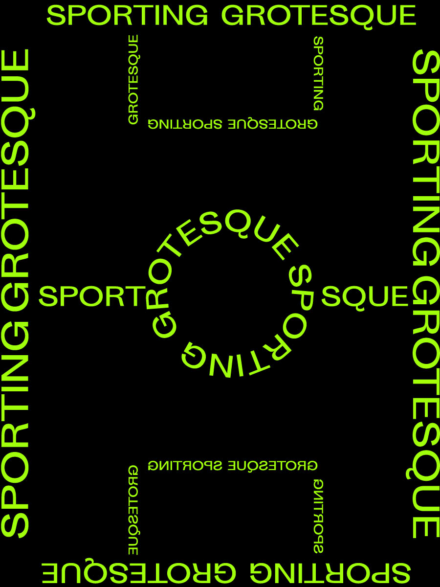 La sporting grotesque a beaucoup de touches calligraphiques. Elle est très aérée et possède de belles courbes agréable à la lecture. Nous remarquons dans les bas de casses, les incisions en coins où les bols et les épaules finissant en pointes. Cela est un particularité définissant la sporting grotesque. Ce détail où les formes rondes sont brisées est fortement mis en valeur et fait partie de l’ADN de la police. Dans l’alphabet grecque, nous remarquons également que les lignes de base établies sont rompues, ajoutant une sensation calligraphique accentuée.